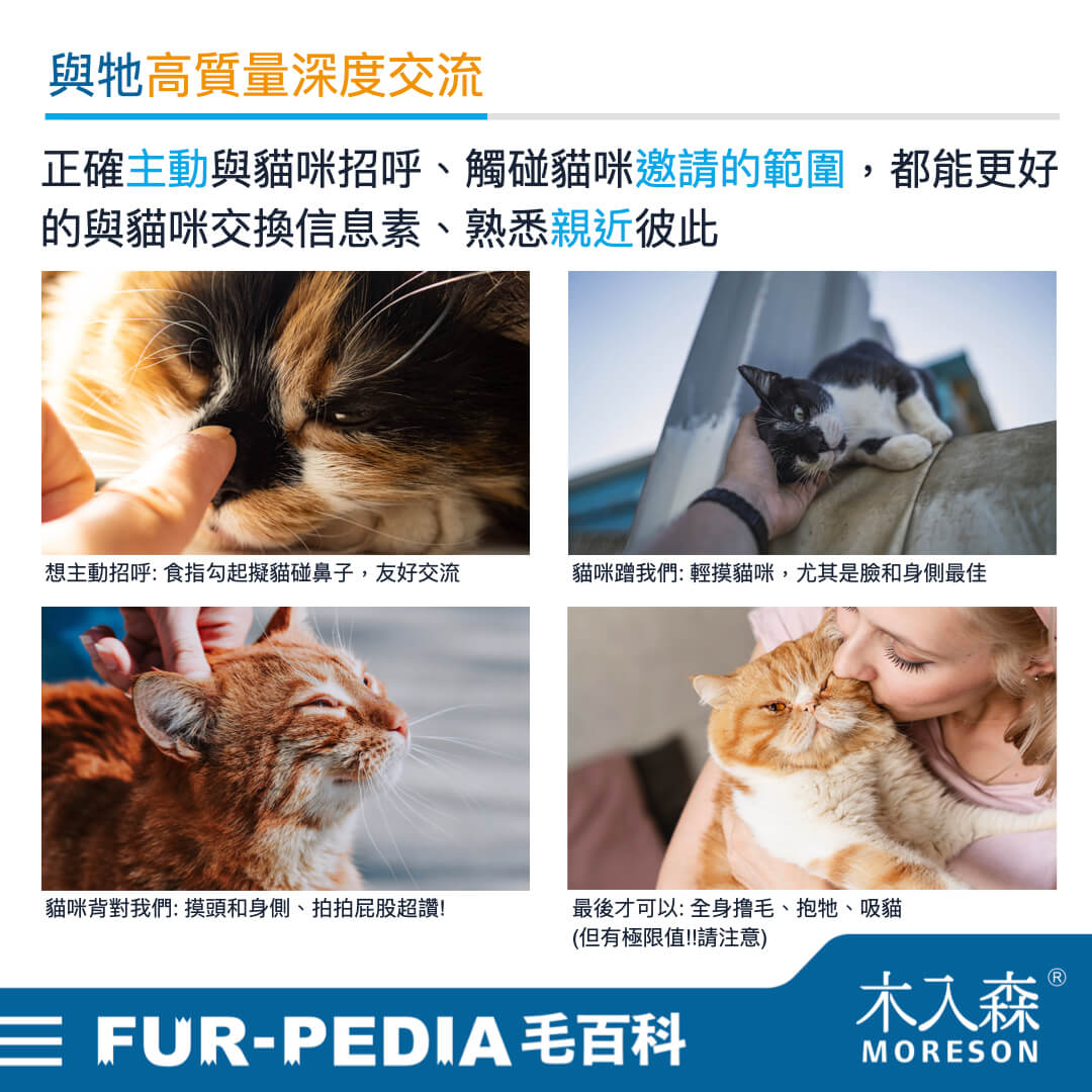 此時我們也應該用貓咪能理解的方式與牠交流,若貓咪沒來找我們,我們想主動與貓咪互動,可以食指勾起放到貓咪鼻子前,作為喵星人碰鼻子的邀請,也就是主動給牠聞我們的氣味,貓咪會理解這是友好的招呼;若貓咪蹭我們,我們可以輕柔撫摸牠的臉與身側,就算牠背對我們,給予深入交流邀請,我們也還是以從後方摸頭、摸身側,或是拍拍屁股端為主,因為這些是貓咪邀請的範圍,可以更多累積信息素的交換、熟悉親近彼此。