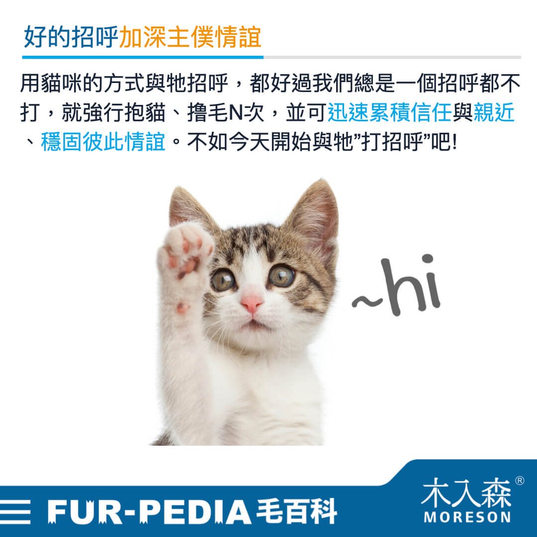 一天當中哪怕我們只進行了一次這樣友好的動作,都好過我們總是一個招呼都不打,就強行抱貓、吸貓或撸毛N次的時間,因為我們在用貓咪的方式與牠互動,牠對我們的行為是可預知的,貓咪對我們的信任、親近反而可以更迅速地累積,且能更好地穩固主僕情誼,敞開更多私領域讓我們觸碰,這才是雙方最舒服的互動喲!快去與你家貓咪正確地”打招呼”吧!