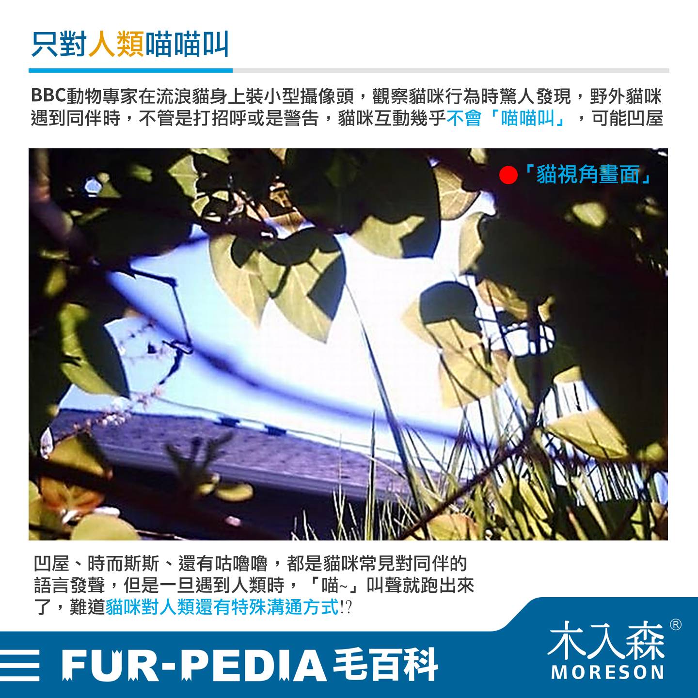 BBC動物專家在流浪貓身上裝小型攝像頭,觀察貓咪行為時驚人發現,野外貓咪遇到同伴時,不管是打招呼或是警告,貓咪互動幾乎不會「喵喵叫」,可能凹屋凹屋、時而斯斯、還有咕嚕嚕,都是貓咪常見對同伴的語言發聲,但是一旦遇到人類時,「喵~」叫聲就跑出來了,難道貓咪對人類還有特殊溝通方式!?