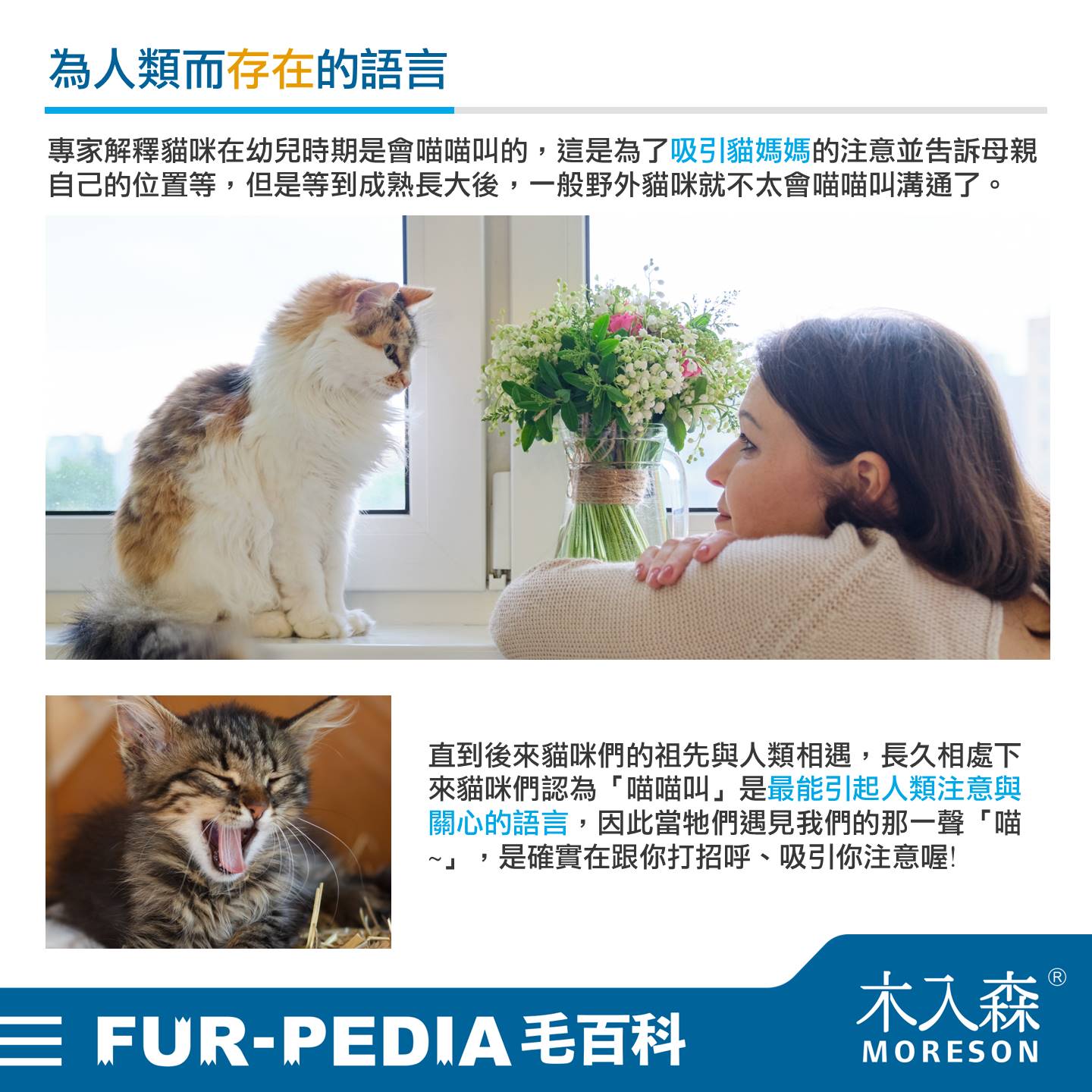 專家解釋貓咪在幼兒時期是會喵喵叫的,這是為了吸引貓媽媽的注意並告訴母親自己的位置等,但是等到成熟長大後,一般野外貓咪就不太會喵喵叫溝通了。直到後來貓咪們的祖先與人類相遇,長久相處下來貓咪們認為「喵喵叫」是最能引起人類注意與關心的語言,因此當牠們遇見我們的那一聲「喵~」,是確實在跟你打招呼、吸引你注意喔!