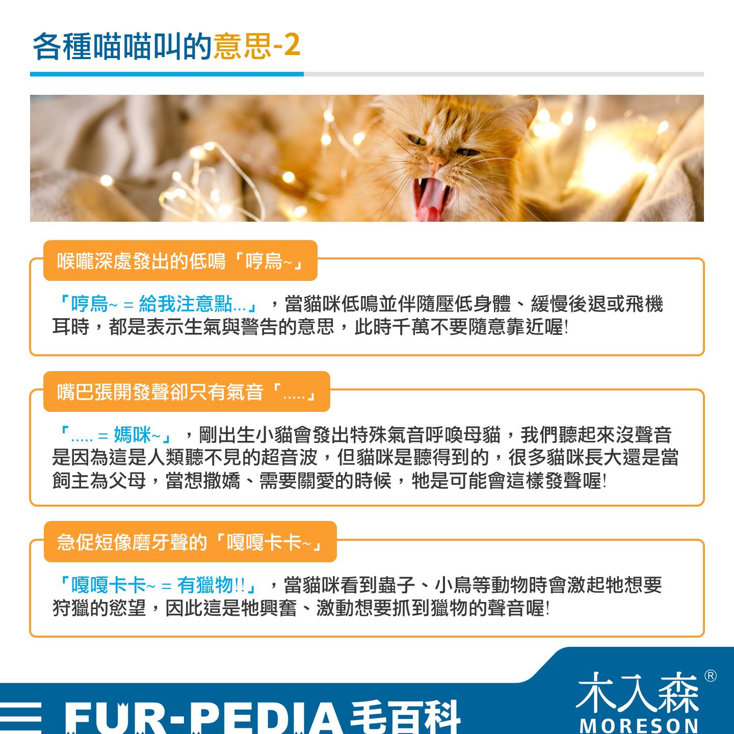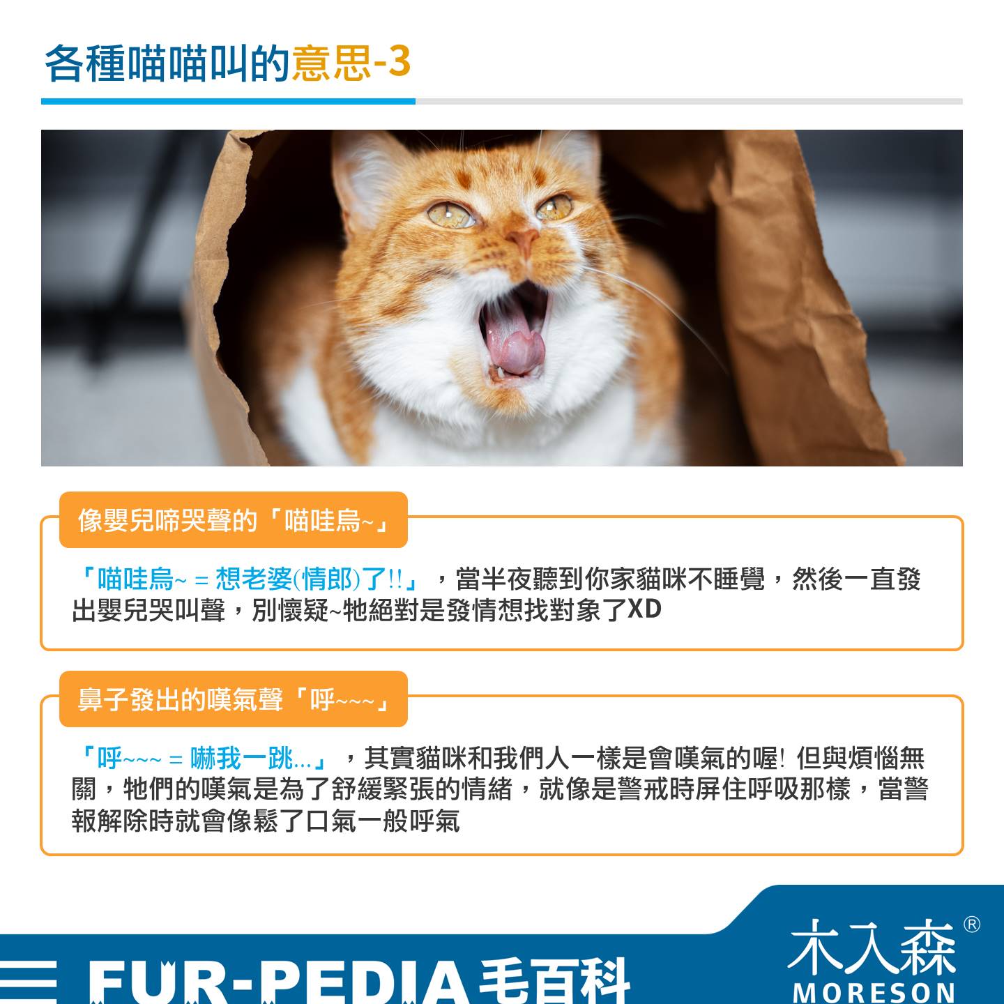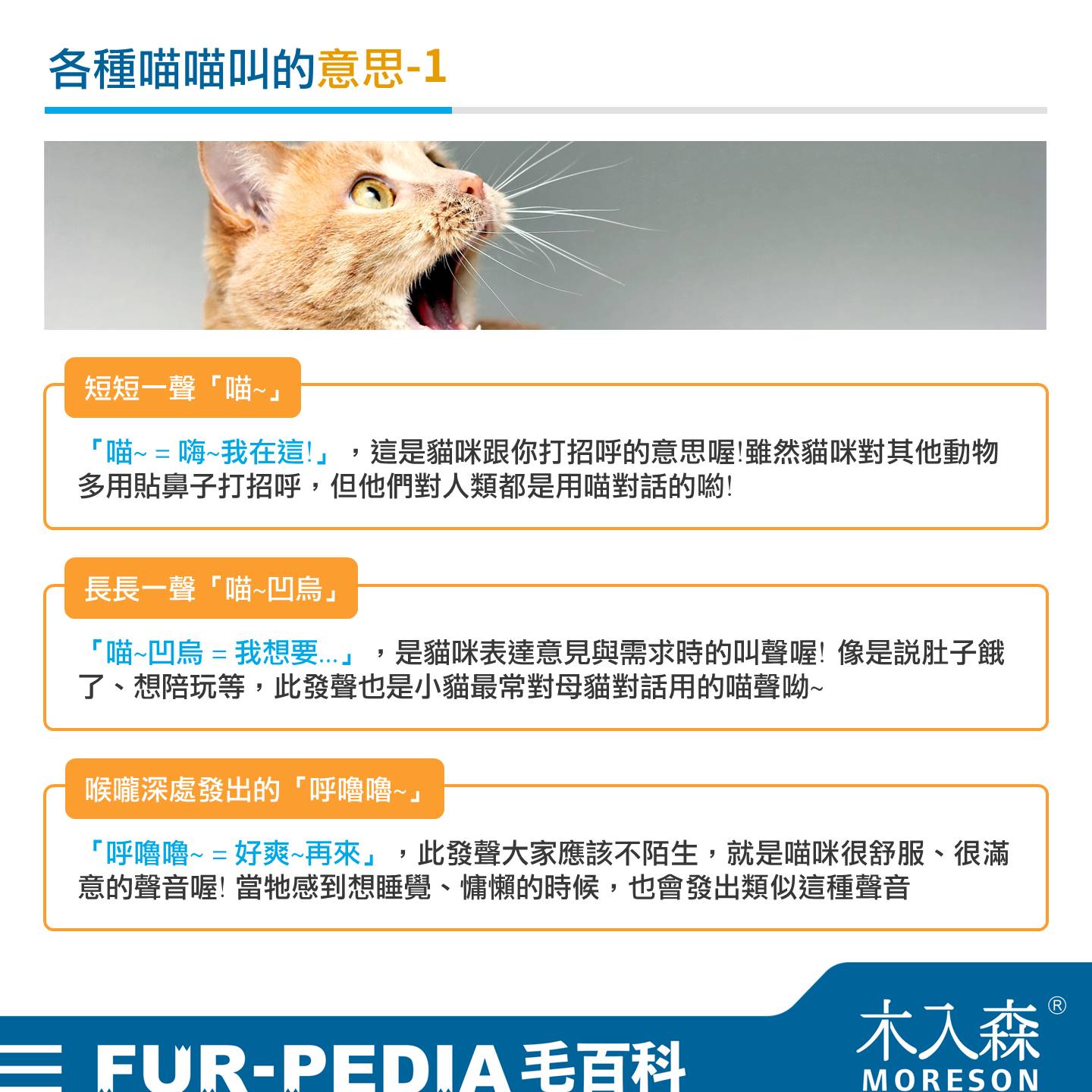 「喵~凹烏 = 我想要...」,是貓咪表達意見與需求時的叫聲喔! 像是說肚子餓了、想陪玩等,此發聲也是小貓最常對母貓對話用的喵聲呦~