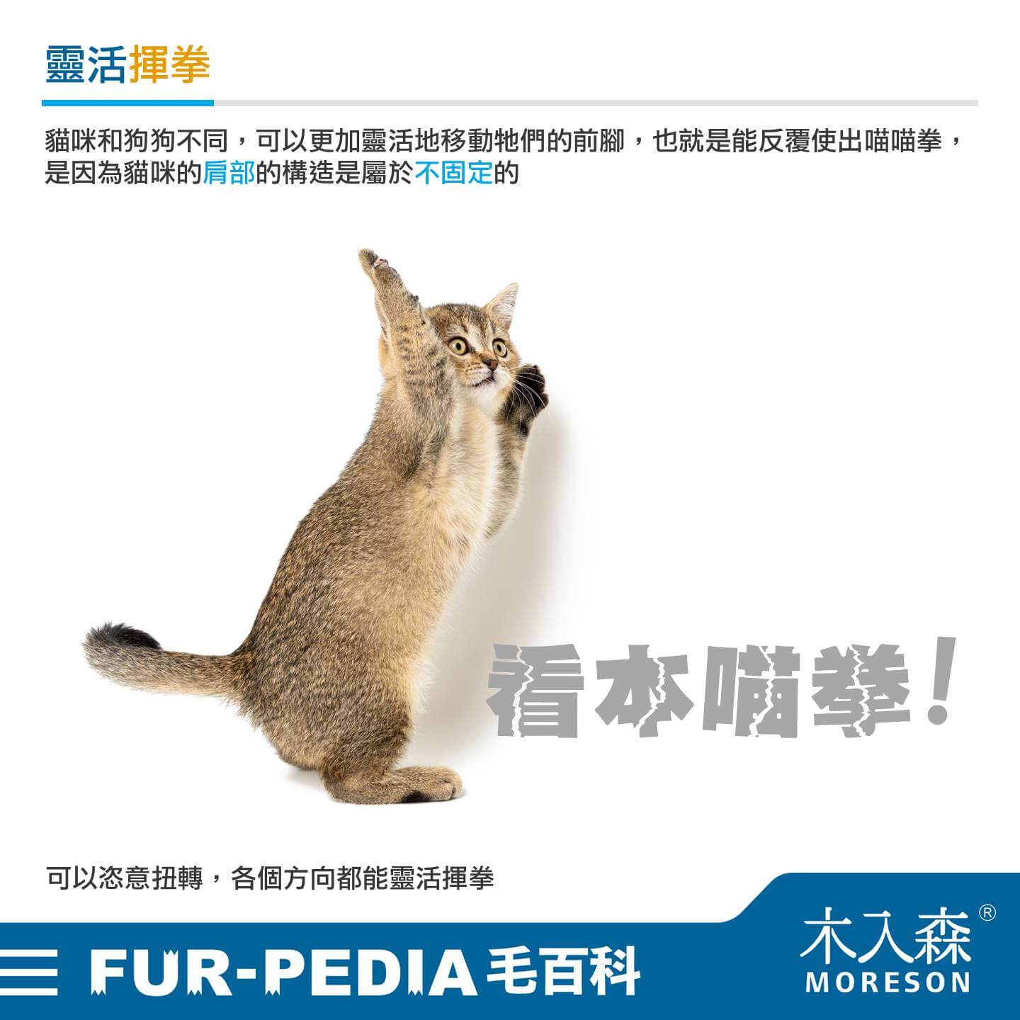 貓咪和狗狗不同,可以更加靈活地移動牠們的前腳,也就是能反覆使出喵喵拳,是因為貓咪的肩部的構造是屬於不固定的,可以恣意扭轉,各個方向都能靈活揮拳。