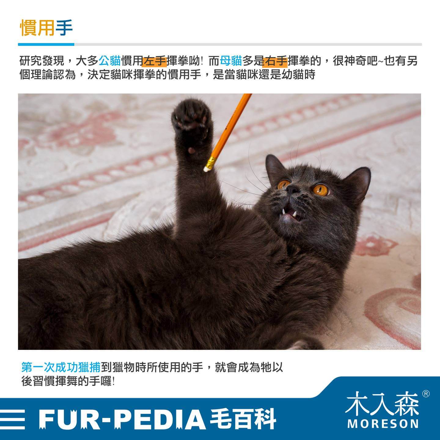研究發現,大多公貓慣用左手揮拳呦! 而母貓多是右手揮拳的,很神奇吧~也有另個理論認為,決定貓咪揮拳的慣用手,是當貓咪還是幼貓時,第一次成功獵捕到獵物時所使用的手,就會成為牠以後習慣揮舞的手囉!