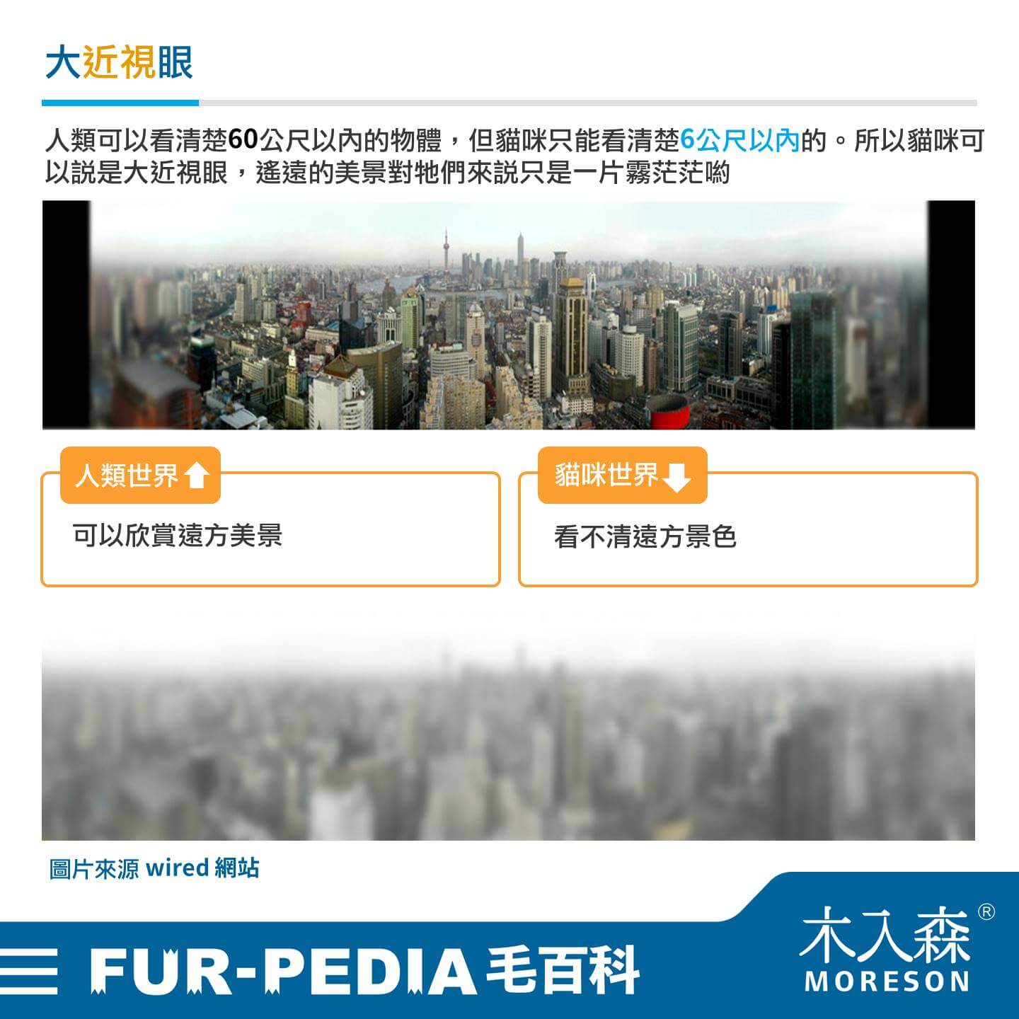 人類可以看清楚60公尺以內的物體,但貓咪只能看清楚6公尺以內的。所以貓咪可以說是大近視眼,遙遠的美景對牠們來說只是一片霧茫茫喲!