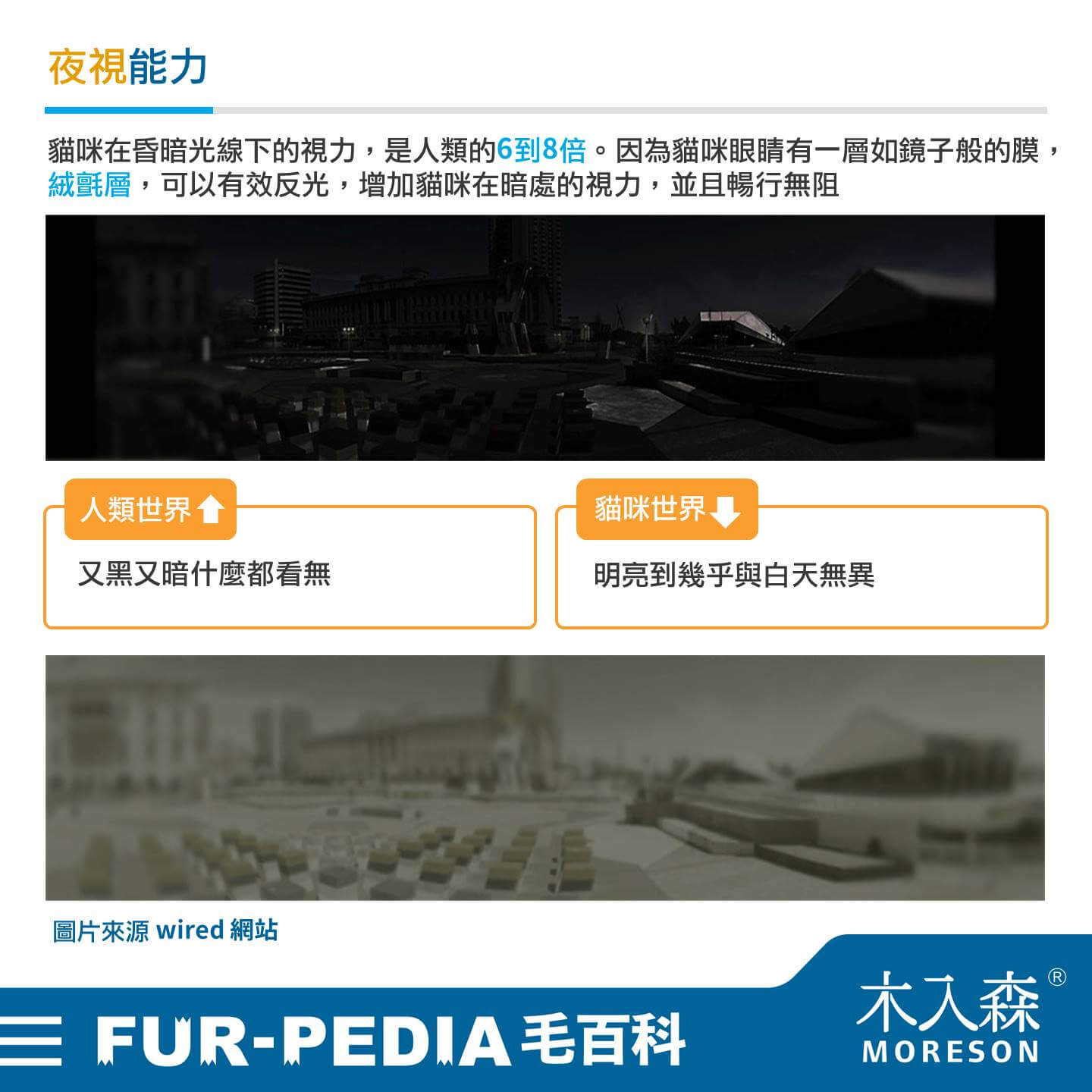 貓咪在昏暗光線下的視力,是人類的6到8倍。因為貓咪眼睛有一層如鏡子般的膜,絨氈層,就是平常不小心拍貓咪會拍到眼睛發光,就是因為絨氈層反光的關係喲! 可以增加貓咪在暗處的視力。