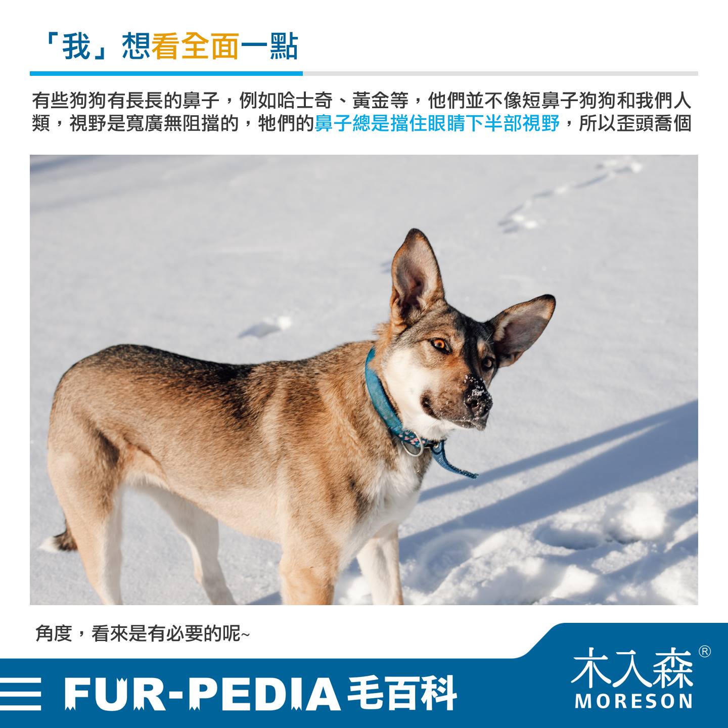 有些狗狗有長長的鼻子,例如哈士奇、黃金等,他們並不像短鼻子狗狗和我們人類,視野是寬廣無阻擋的,牠們的鼻子總是擋住眼睛下半部視野,所以歪頭喬個角度,看來是有必要的呢~