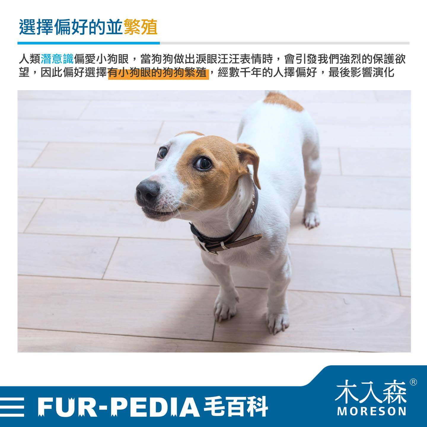 人類潛意識偏愛小狗眼,當狗狗做出淚眼汪汪表情時,會引發我們強烈的保護欲望,因此偏好選擇有小狗眼的狗狗繁殖,經數千年的人擇偏好,最後影響演化。