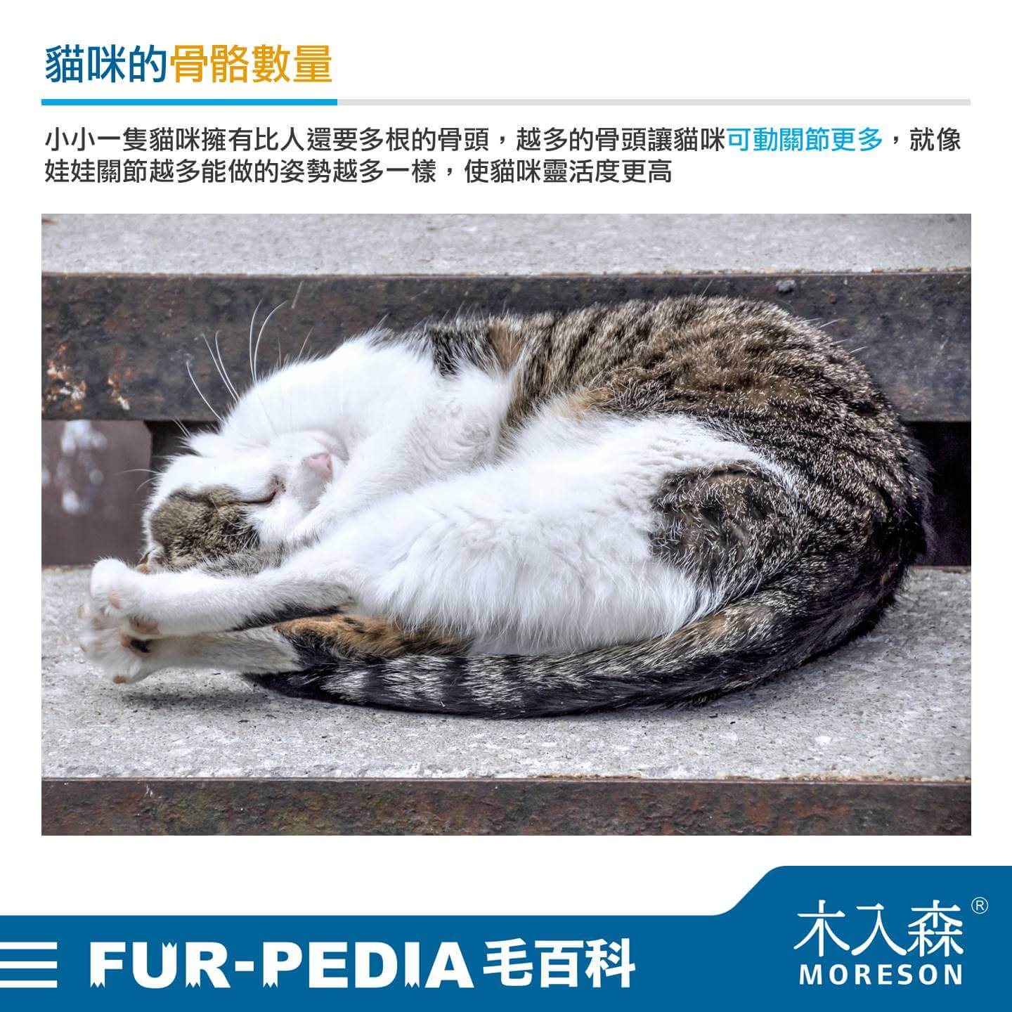 小小一隻貓咪擁有比人還要多根的骨頭,越多的骨頭讓貓咪可動關節更多,就像娃娃關節越多能做的姿勢越多一樣,使貓咪靈活度更高。