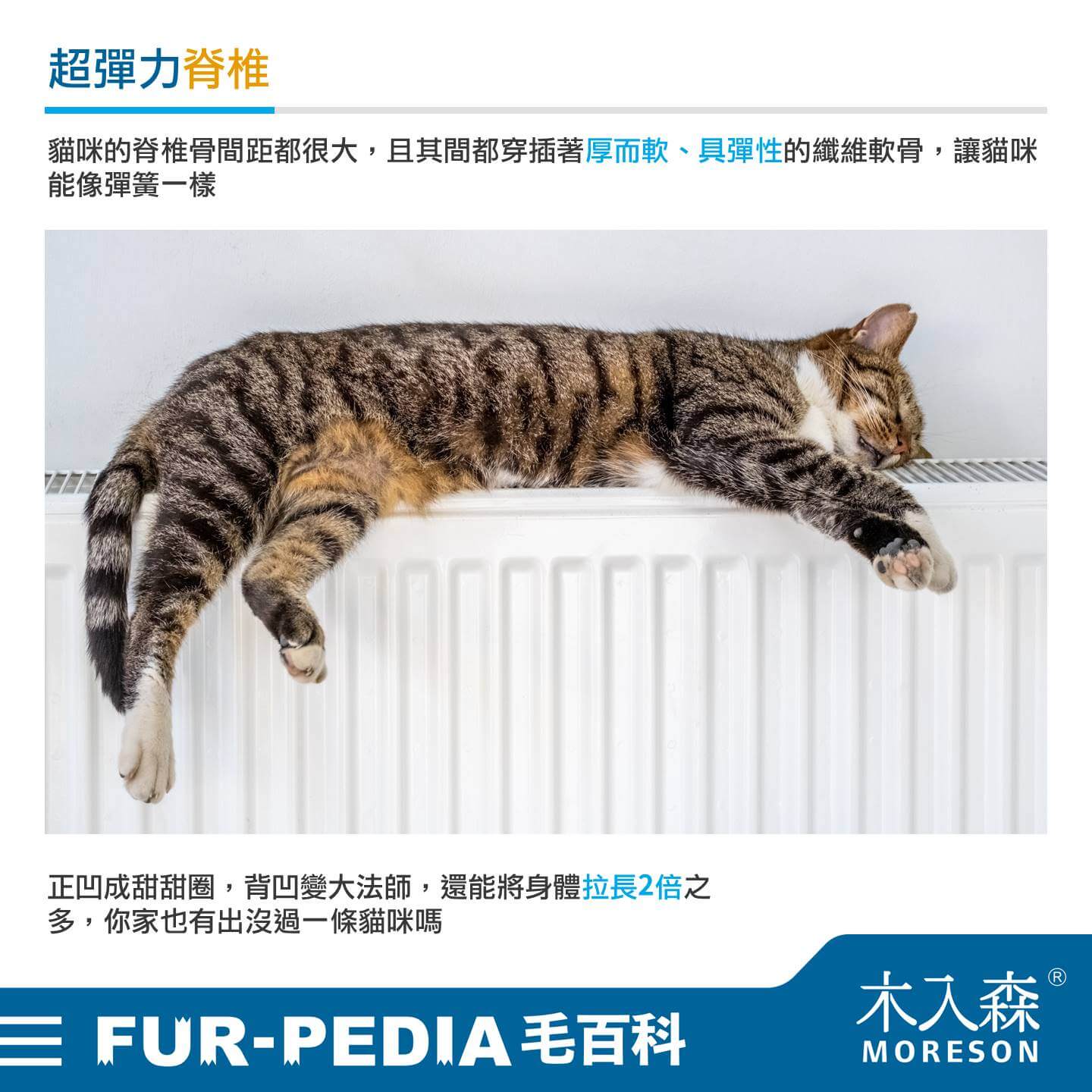 貓咪的脊椎骨間距都很大,且其間都穿插著厚而軟、具彈性的纖維軟骨,讓貓咪像彈簧一樣,正凹成甜甜圈,背凹變大法師,還能將身體拉長2倍之多,你家也有出沒過「一條」貓咪嗎?